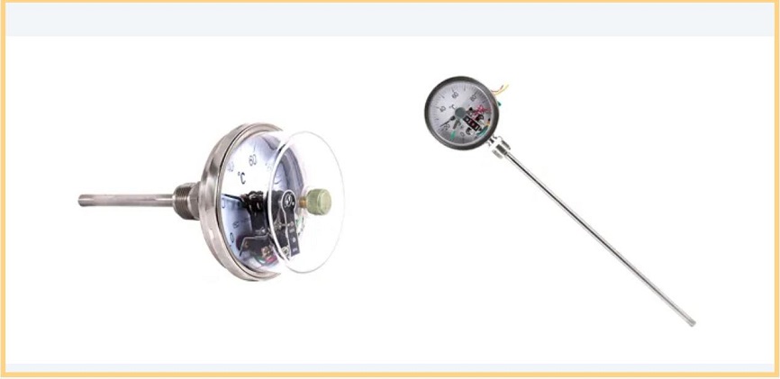 · جهاز الاتصال الكهربائي (مكون المفتاح للتحكم في درجة الحرارة): يتكون من جهات اتصال ثابتة وجهات اتصال متحركة. تتحرك جهات الاتصال المنقولة جنبا إلى جنب مع المؤشر. عندما تصل درجة الحرارة إلى قيمة الإعداد المسبق ، تقوم جهات الاتصال بالاتصال/الفصل ، مما يؤدي إلى وجود إنذار خارجي أو دائرة تحكم (مثل بدء المروحة ، وإغلاق المدفأة).
